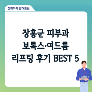 이제 장흥군 내에서 가장 전문성과 후기가 좋은 피부과 병원 5곳을 소개하겠습니다. 이 병원들은 보톡스, 여드름, 리프팅 등 다양한 피부 관리 서비스를 제공하고 있습니다.