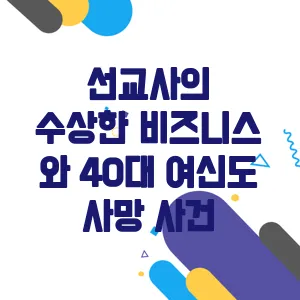 이번 사건의 핵심 인물인 선교사 이씨는 과연 어떤 사람일까요? 그는 자신을 선교사라고 소개하며 신도들을 모아 활동해왔지만, 그의 행적에는 의문점이 많습니다. 그의 수상한 비즈니스와 40대 여신도의 사망 사건이 어떤 연관이 있는지 자세히 살펴보겠습니다.