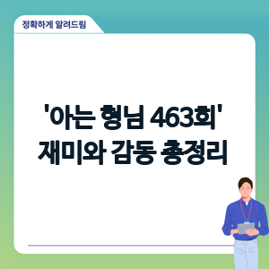 '아는 형님'의 열렬한 팬일까요? 매회 방송되는 이 예능 프로그램에서는 어떤 재미있고 감동적인 에피소드들이 펼쳐질까요? 이번 463회에서는 과연 어떤 특별한 순간들이 있었을까요?